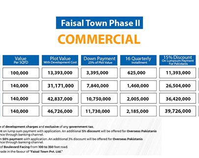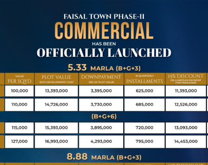 Faisal Town Phase 2 borders Fateh Jang Road in Islamabad and now provides newly released commercial plots throughout the main Boulevard area.The plots feature structured designs and offer convenient payment terms. They are centrally located and highly visible for maximum exposure.