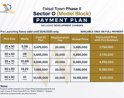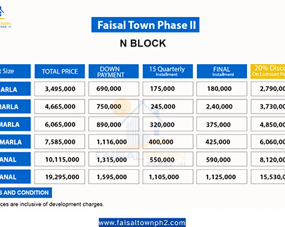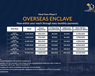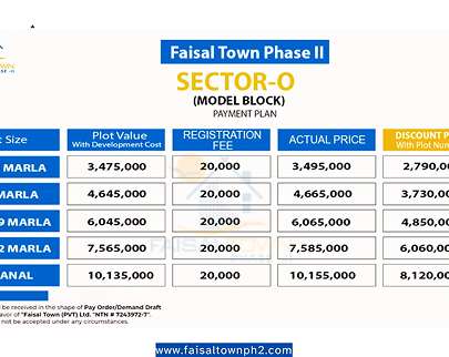 Investing in Faisal Town Phase 2 Overseas Enclave is made easy with flexible and budget-friendly payment plans. These options cater to a wide range of investors, accommodating both immediate and long-term investment strategies. For specific details regarding payment plans, it is advisable to contact the developer or authorized agents, as they may vary depending on plot size and location.